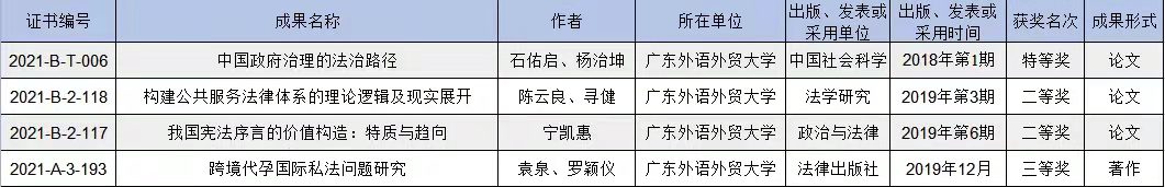 近日,广东省人民政府发布了关于颁发第九届广东省哲学社会科学优秀成果奖的通报,公司共有4项成果获得奖,分别为石佑启教授和杨治坤教授合著的论文获得特等奖1项,陈云良教授及寻健博士合著论文获二等奖1项、宁凯惠博士论文亦获二等奖1项,袁泉教授及罗颖仪博士合著著作获三等奖1项。