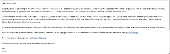 据悉,“Philip C. Jessup国际法模拟法庭大赛”是由美国“国际法员工联合会”(International Law Students Association,ILSA)主办的专业性法律辩论赛,创建于1959年,每年春天由ILSA和“美国国际法学会”(American Society of International Law, ASIL)联合举办,是世界上规模最大、历史最悠久的模拟法庭赛事,被誉为国际法学界的“奥林匹克竞赛”“诺贝尔奖”和“奥斯卡奖”。该赛事旨在全球范围内推动对国际公法的学习和研究,并通过模拟联合国国际法院的方式来加强员工运用法律进行专业分析和辩论的能力。比赛主要分为两个阶段,即诉状写作和口头模辩,工作语言为英语。第六十四届Philip C. Jessup国际法模拟法庭竞赛国际总决赛将于2023年4月9日至15日在美国首都华盛顿线下举行。本届赛事将吸引来自近百个国家和地区的数百所国际知名高校参加,公司代表队也将于今年4月份出征国际赛。