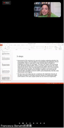 2023年3月6日至10日,来自意大利米兰圣心大学的弗朗西斯卡·贝纳蒂(Francesca Benatti)教授受邀为公司师生举办了“数字经济时代法律与科技的互动”海外名师线上系列讲座。主讲人贝纳蒂教授基于学科交叉和比较法的视角,聚焦分析了法律与科技互动的前沿问题、立法异同及争议案例。讲座共计五场,由公司教师殷峻博士和杨幸幸博士先后担任讲座主持与翻译。