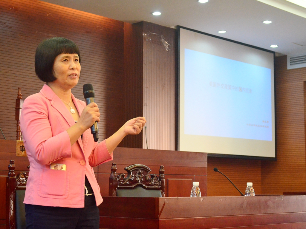 首先,她强调,研究外交要从了解内政开始,因为对外政策源于国家的内部需要,对外战略由国内政治决定,而不是由其他任何国家或国际行为体决定。美国对外政策不是总统或者总统身边的人能够决定的,而是由各部门、党派、利益集团等在相互竞争、相互牵制、相互妥协中形成的。她引自己曾经看过的一篇论文为例,认为明确文章观点的背后要注意确认撰笔人是否有具有政府经历的党派色彩。顺着美国内政的讲述思路,魏红霞又为大家详尽介绍了参与美国外交政策的政府机构,包括美国总统和国家安全委员会、国务院、国防部、中央情报局等职能部门、美国国会及其组织机制和社会机构。在这方面的介绍中,她肯定了美国政治制度的制衡特点,同时也就近年来备受关注的美国枪支管控话题、族裔事件进行探讨。