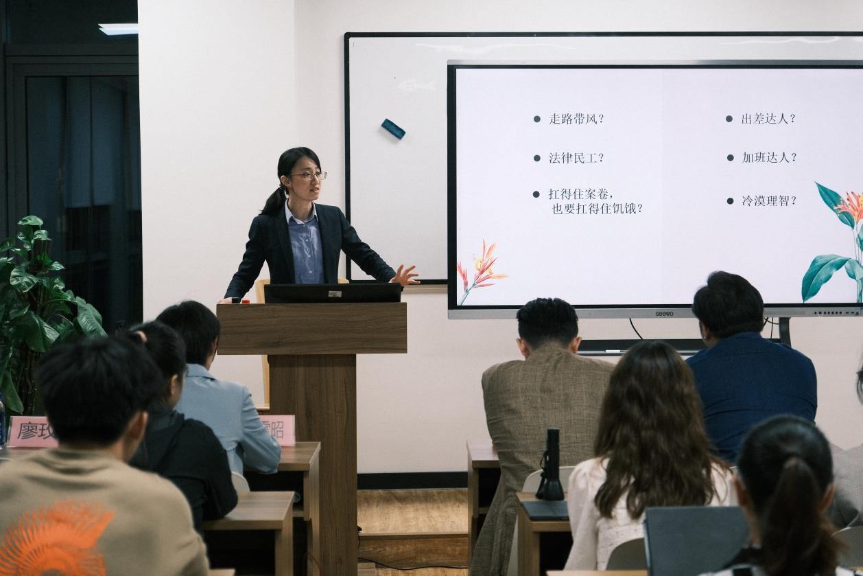 本次讲座主讲人为王雪昭律师和廖玫律师。王雪昭律师以个人求学经历为引,首先进行了自我介绍,其优秀履历成功吸引了在场观众的注意力。紧扣着讲座主题,王律师讲述了生育对其职业道路的影响,并分享了自己的应对方式。在工作和家庭的平衡问题上,王律师的解决之道是严格的时间安排。在求职经验上,她认为求职者应提高核心竞争力,简历的信息是个人积累的努力的体现。