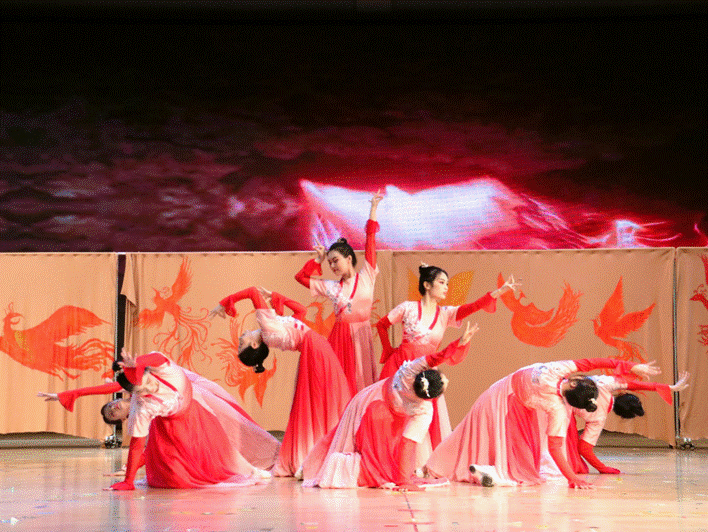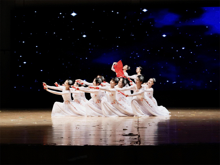 晚会以校舞队优美的表演《扇舞华篇》开场,飞扬的白裙,开合的红扇,以舞为笔,点中国红色文化发展。