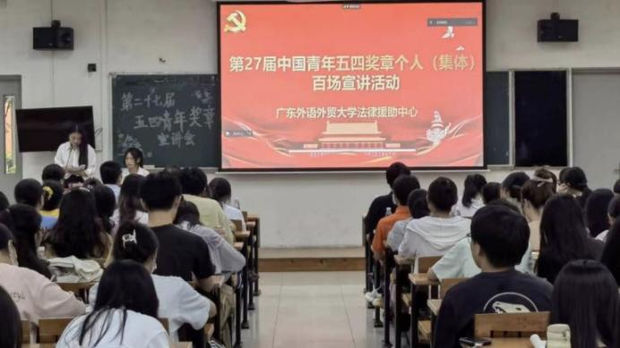 宣讲活动在同学们的热烈掌声中结束,五四青年奖章的设立旨在树立政治进步、品德高尚、贡献突出的优秀青年典型,反映当代青年的精神品格和价值追求,发挥优秀青年的模范作用,为广大青年指引奋斗的方向。展望未来,广外法援将紧跟党的领导,扎实脚步,继续秉承“以法之手,愿您之需”的宗旨,不忘初心,以身作则,发挥自身的模范作用,以自身先进事迹团结引领广大青年坚定跟党走的信念,涵养进取品格、笃行强国之志、传递青春之火,营造青春向党、奋勇争先的良好氛围,带动广大共青团员为全面依法治国贡献青春力量,让青春的绚丽之花长久绽放于我国法治建设的沃土之上。