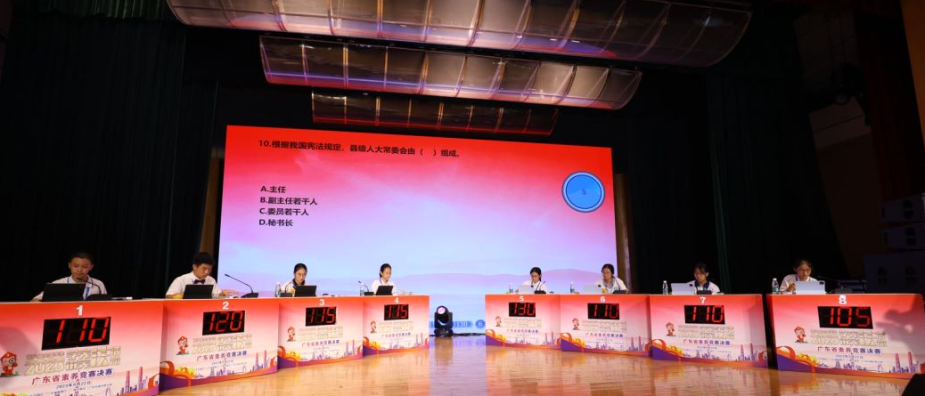 素养竞赛决赛共分为小学组、初中组、高中组和高校组四个组别进行,参赛选手是每组笔试阶段进入前八名的员工。每场比赛设有必答题、抢答题和理解题三个环节,全面考察选手对习近平法治思想、宪法法治知识以及党的二十大精神的理解和掌握,包括宪法基本知识和实际应用能力,考点同时涉及民法典、环境保护、未成年人保护、预防未成年人犯罪、防范校园欺凌、国家安全等相关内容。