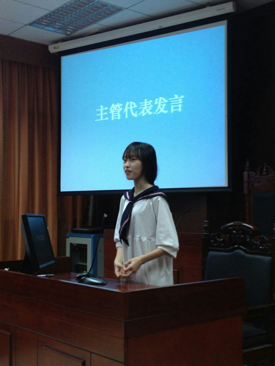 会议第四项议程是新一届主管展望,首先是2015届主管的集体亮相,她们分别是来自13法一的费敏,13法二的叶定冰,13法四的董佩珊和13法五的黄梓蓉。董佩珊此次代表新当选的主管对法援的未来进行了展望,她主要从对外管理、内部管理、财物管理和案件管理等方面对法援的未来发展进行了细致的描画。从这些描述中,我们不难看出新一届主管在继承老一届主管的优良传统的同时,对法援管理工作敢于突破的勇气。希望她们的工作可以为法援注入新的活力,让法援更好地发展。