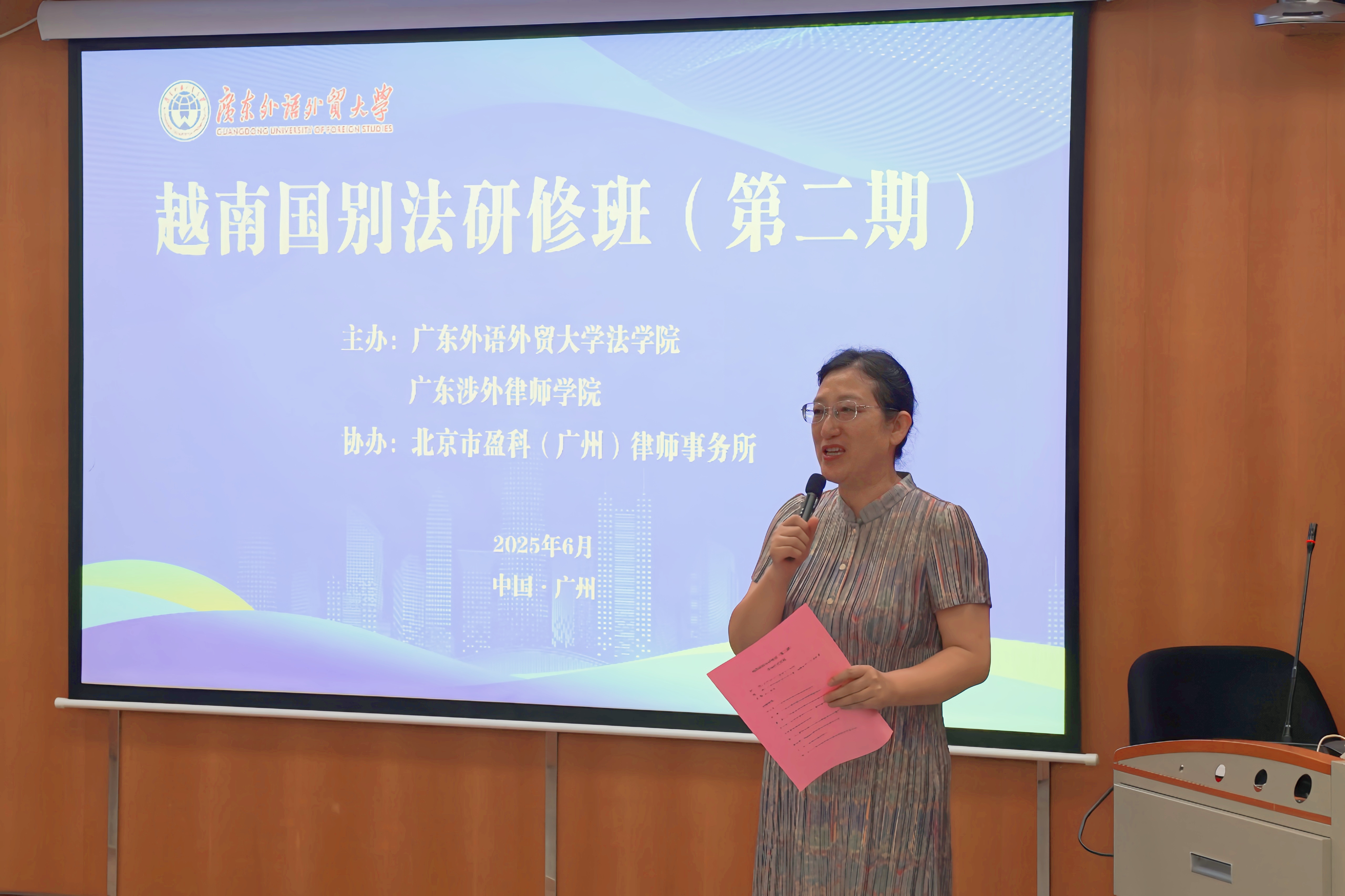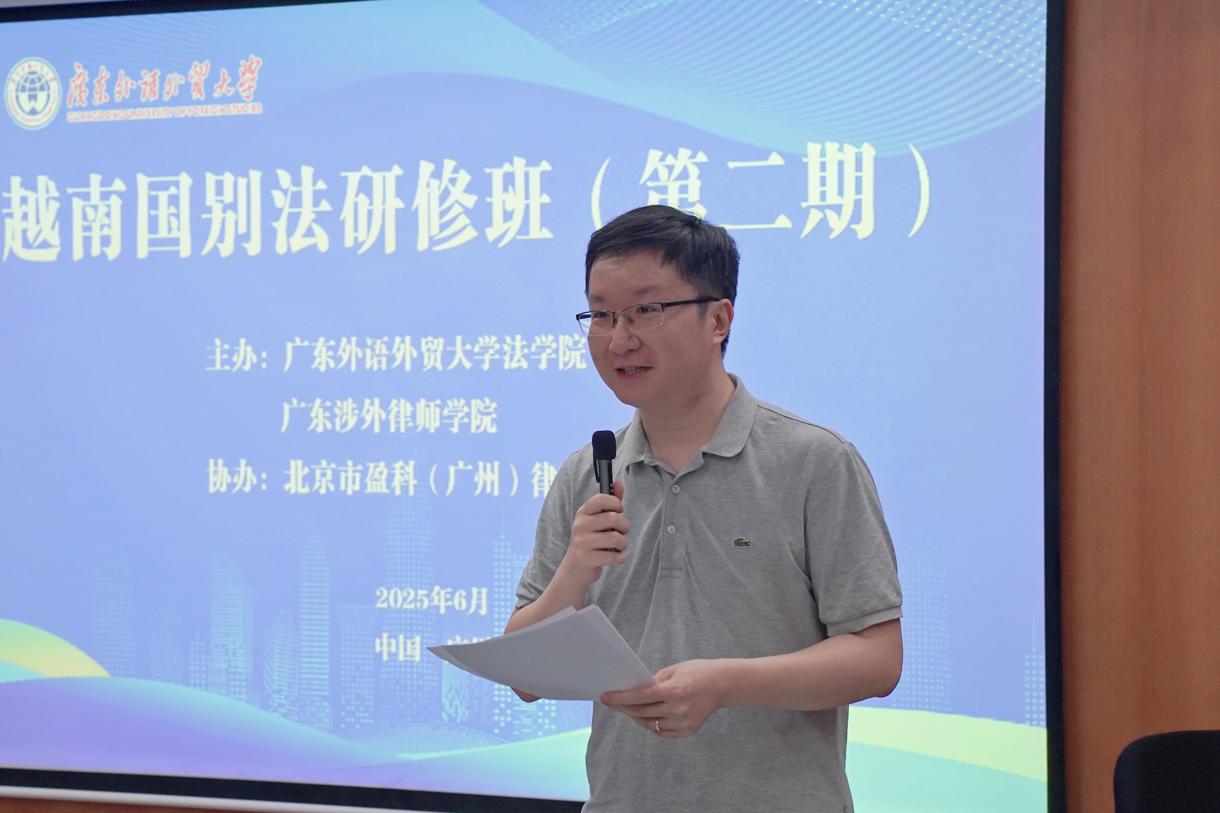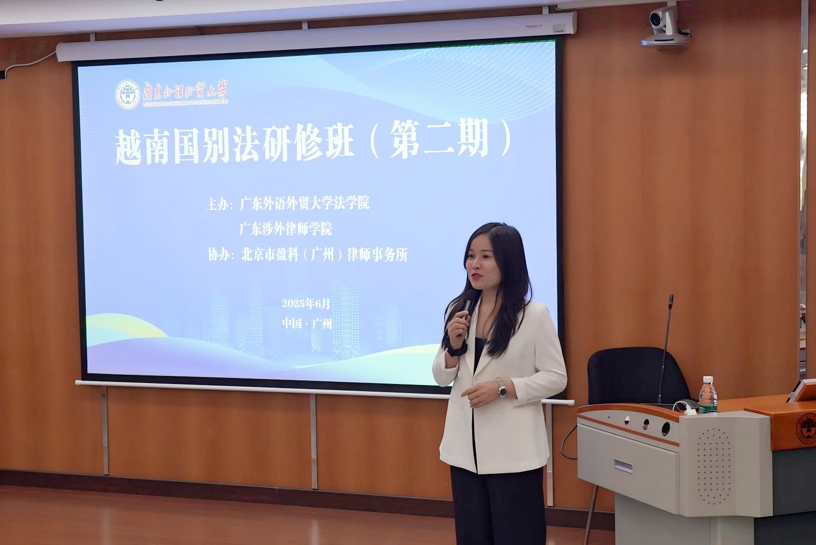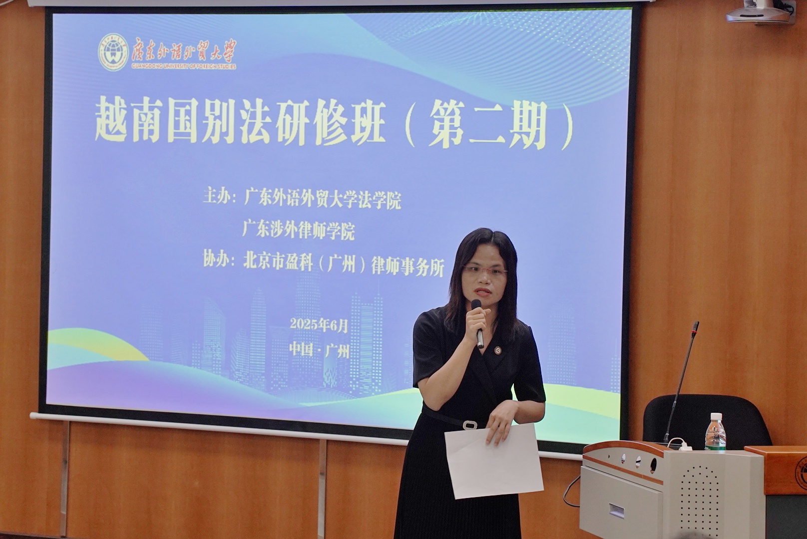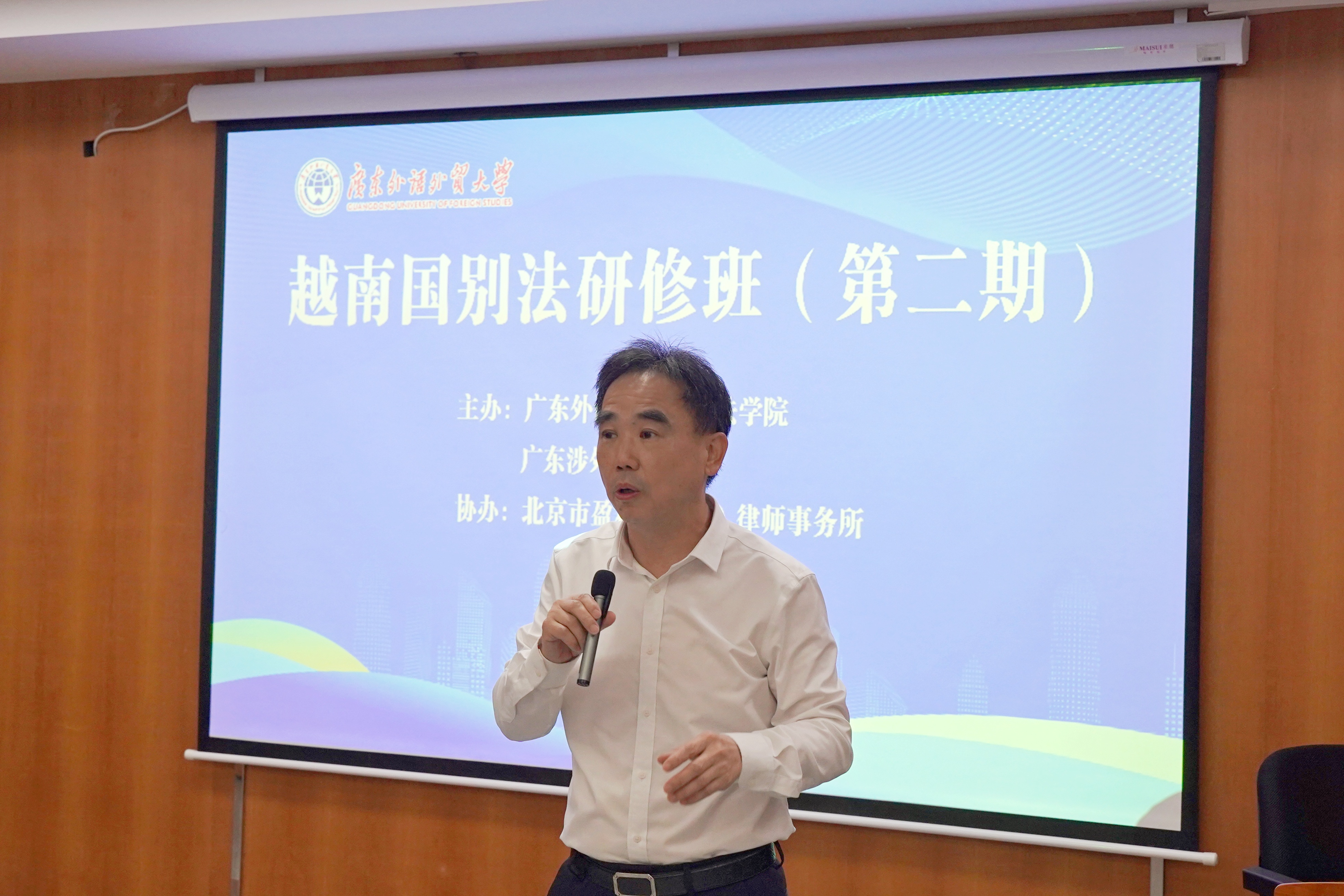 广东省贸促会境外代表处事务部三级主任科员崔韵介绍了广东省和越南近年来的经贸合作情况。他说,此次研修班是一个很好的交流和共享平台,作为此次研修班的授课教师,期待与本次培训班各位学员探讨广东与越南经贸背景下法律服务“走出去”的更多可能性。