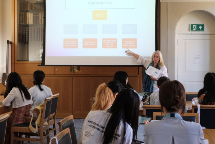 8 月 12 日上午,剑桥大学三一公司院士凯瑟琳・巴纳德教授(Prof. C. Barnard)以《贸易法:不同程度的一体化与单一市场》揭开课程序幕。她以欧盟为研究范本,层层解析经济一体化从自由贸易区到货币联盟的演进层级,深入阐释单一市场的核心要素与法律支撑体系,生动展现法律在全球贸易网络中的规制功能与枢纽地位。