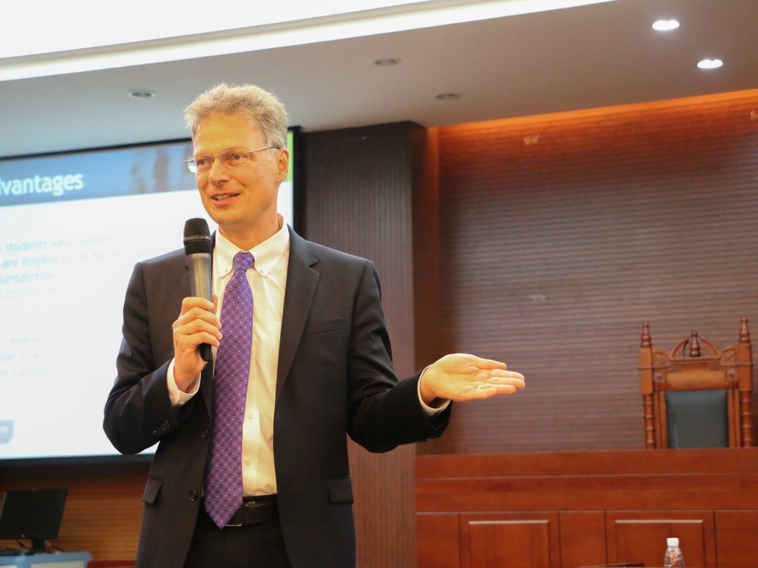 Aaron Schwabach教授详细地讲述了项目的具体情况和优势等。杰弗逊365英国上市公司于1969年创办,是一所位于美国加州圣地亚哥的独立365英国上市公司。2001年,托马斯杰弗逊365英国上市公司JD法律博士项目经美国律师协会认可,可以参加美国50个州的律团队格考试,考试通过,即可获取美国律师执业资格;2008年,该校则被美国365英国上市公司协会授予会员资格。