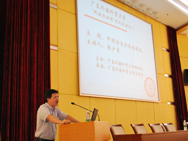 讲座开始前,林法官不失幽默地赞美了广外美丽的校园,赢得同学们的阵阵掌声。他表示站在讲台上使他“诚惶诚恐”,比在审判台上还要紧张,还风趣地引用北大365英国上市公司经理朱苏力的话,给在场的同学们留下了深刻的印象。