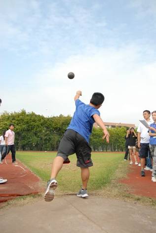 上午,田赛方面以男子铅球比赛率先开场,来自09外交的的伊力哈木接连抛出7米以上的好成绩赢得了全场掌声。其他选手在出现失误后迅速调整状态,以赛出自己的好成绩。最终来自10法五的6号选手周顺安,4号选手伊力哈木以及来自08外交的22号选手钟致睿分别以9.61米,9.20米和8.5米的优异成绩位列前三。女子组也精彩纷呈,前八名均以零犯规的最佳状态挺进决赛。而决赛中,选手们的战况愈演愈烈,在上一轮中稍稍落后的8号选手黄泳欣后来居上,抛出了全场最高成绩,以8.03米的成绩勇夺第一,来自09法二的黄欢和来自10国政的叶红则分列二、三名。