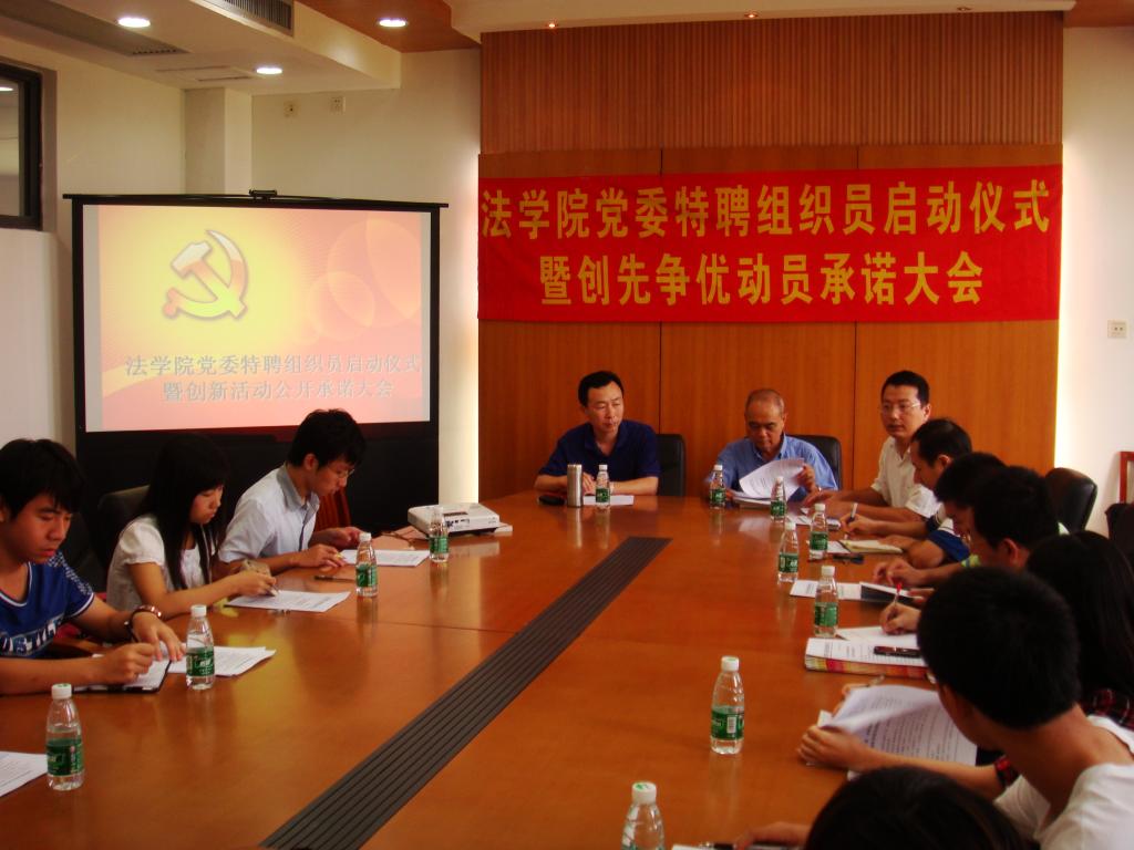 (文字:姚震乾 图片:姚震乾)2010年9月29日早,法公司党委特聘组织员启动仪式暨创先争优动员承诺大会在南校区院系楼404会议室召开。本次会议,一方面是法公司党委邀请到公司党委特聘组织员冯益谦教授,为与会的员工党员干部对上级党委有关争先创优活动的精神进行辅导,另一方面也是法公司党委部署争先创优活动承诺阶段的重要会议。法公司党委书记金良成,副书记卢海清,各年级辅导员老师及各支部委员、党员代表出席会议,会议由卢海清主持。