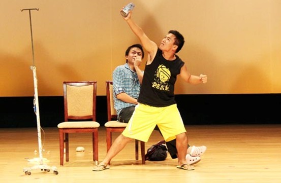 法律硕士研究生雷浩、郑璇等同学带来的哑剧《有病》继续将文艺演出推向高潮。两人表演的是医院里两个刚看完病的穷人和富人的故事,富人炫耀自己富足的生活,瞧不起乡下来的穷人,穷人受不了富人的炫耀,与富人较劲。哑剧的结尾,富人拿出一瓶可乐再穷人面前晃动,以示穷人土里土气,穷人找遍了大挎包,却发现自己没有任何东西能与富人相比。一怒之下,穷人拔下正在输液的药水瓶,自己猛灌下去,随即倒在地上不省人事。富人见状,眼看要出人命,便放下自己刚才高傲的姿态,给穷人做了人工呼吸,将穷人救醒,两人最终言和。该剧配合幽默、诙谐的声效,演员的滑稽、夸张动作和表情,颇具无厘头恶搞风格,赢得台下阵阵欢呼。