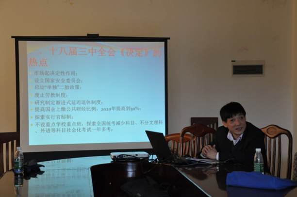 教务处处长詹文都从学习贯彻十八届三中全会精神,解读热点问题,立足反腐败和官德建设教育从九个方面谈如何将权力关进制度笼子,如何从文化生态环境着手,从内部外部控制官德管理。从法学专业建设出发,谈如何将十八届三中全会精神融入教学和工作中。