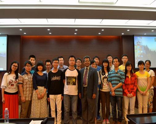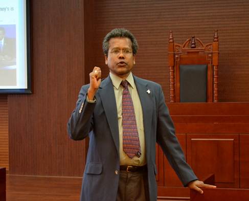 本网讯(文字:沈俊芳 摄影:邢艺欣 来源:365英国上市公司庄婉宜) 继上学期讲座“The Chinese Dream and American Happiness: Does the Constitutionalism Matter?”之后,2014年4月24日15点,乔治梅森大学的教授Patrick Mendis 又来到了广外。外交学社在大模拟法庭举办由Patrick Mendis主讲,以“The US Mid-Term Elections and their influence on Sino-American Relation”为题的讲座。