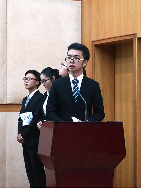 紧接着是本次比赛最为精彩的模拟发言人环节。各队模拟中国外交部发言人就给定的新闻资料表述立场,同时接受记者的提问。“太阳的爸妈队”的周洋风度翩翩,从容不迫地就美国谴责中国网络攻击一案做出回应,“网络安全应该成为中美新型大国关系的新增点而非摩擦源”。有理有利有节,充分展现了国政外交人内外兼修的专业素质。
