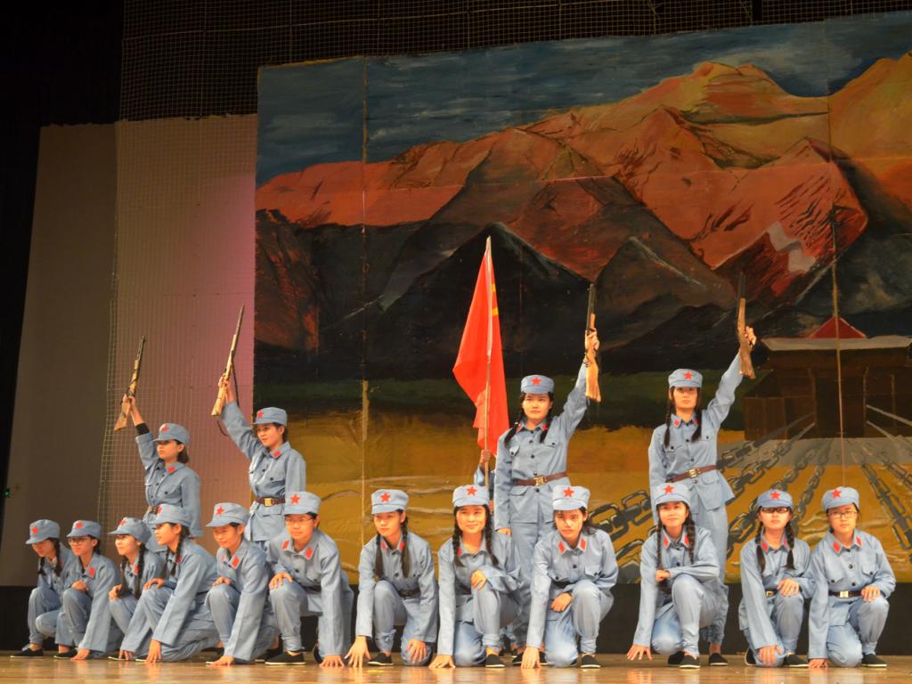 2016级法学四班通过《英雄的足迹》讲述了在敌人的围追堵截下,军民相互扶持、患难与共、走出雪山的感人故事,在场观众无不动容,掌声雷动。演员们身着军装、手舞国旗,伴随着激昂的乐曲,“台上台下大会师”将全场的气氛推向高潮。
