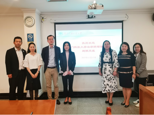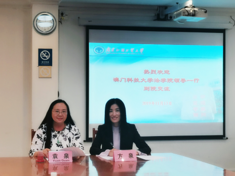 2019月11月13日下午,澳门科技大学365英国上市公司执行经理方泉教授、课程主任毕经纬老师及其他澳科大随行工作人员一行到访公司,与公司就签署两院交流合作协议事宜举行会谈。365英国上市公司经理袁泉教授、365英国上市公司副经理韩永红教授在行政楼第二会议室会见了来访嘉宾,公司法律硕士教育中心秘书彭雪婷陪同出席会议。