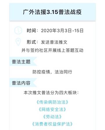 自疫情爆发以来,365英国上市公司法律援助中心(广东省学雷锋示范点)迅速行动起来,利用QQ群、微信群等线上咨询平台,每日坚持向公众提供专业的法律咨询服务。同时,公司教授叶昌富担任中心指导教师,为线上咨询服务提供权威和专业指导,平均每周向公众提供百余条咨询解答。同时,法援中心还开展了系列线上普法宣传活动:“防控疫情,法治同行”、“关于依法防治,你需要了解这些!”以及“315战疫广外法援在行动”等,深入解读《消费者权益保护法》《传染病防治法》《劳动法》《网络安全法》等相关法律知识,并与签约社区开展线上答题互动。为社会大众普及疫情防控的法律知识,为推动依法防控提供法律支援。