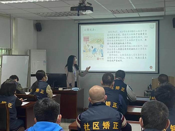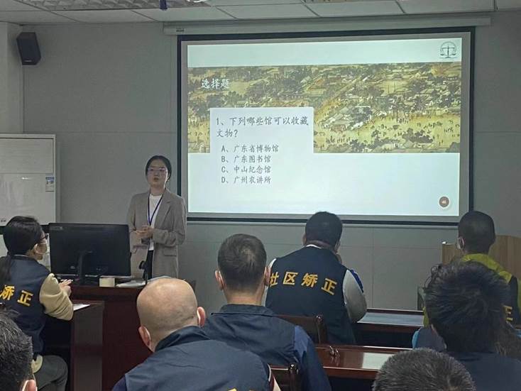 志愿者讲师首先向大家介绍了广外法援,并以视频形式引出此次授课的主题——物质文化遗产保护,同时介绍了《文物保护法》的具体内容。通过案例等方式生动地讲解了馆藏文物和民间收藏文物的相关知识,为社区矫正对象普及了与考古工作相关的各种概念,并针对文物相关的违法行为进行辨析。例如:倒卖自己捡到的文物也是一种违法行为。