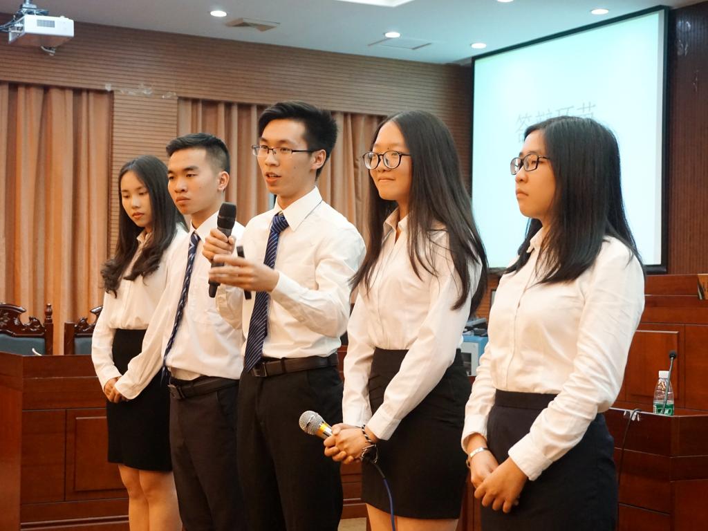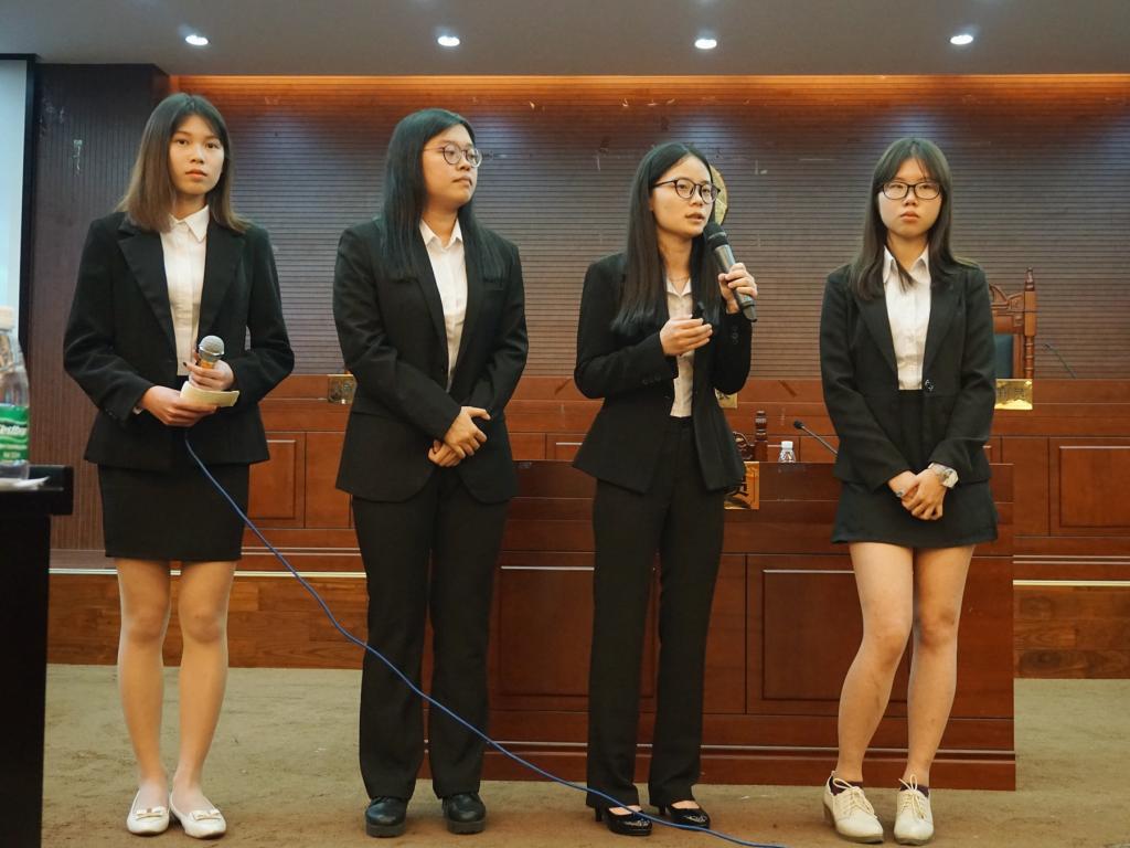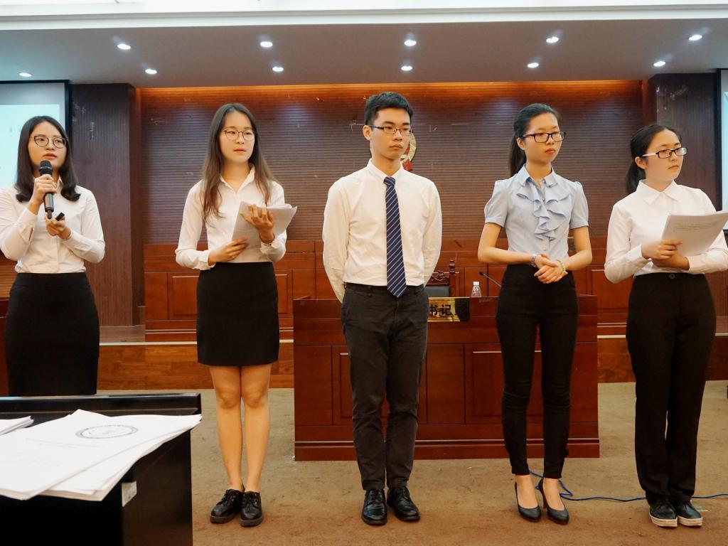 本网讯(文字:陈文茹 摄影:陈秀琴 网编:王奕霖) 3月28号晚,第四届法律文化节开幕式暨第十一届调研大赛决赛于实验楼B307大模拟法庭举行。出席本次活动的有法公司党委周秀娇书记、党委林茂辉副书记、范利平教授、杨斐教授、陈勇副教授、修文辉老师、廖伟智老师、范丽颖老师、陈文华老师、团委书记陈宇老师以及团学主席团成员。