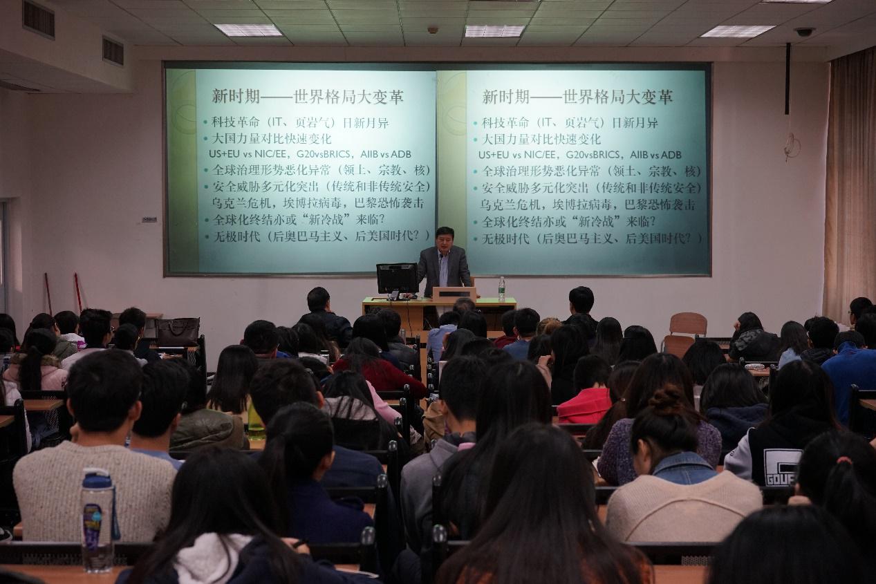 关贵海的语言风格幽默风趣、学术观点睿智深刻,不仅活跃了现场气氛,又引导了现场同学对中俄关系进行更深入的思考。在最后的提问环节,同学们争先恐后的提出自己的疑问,其中既有个人对中俄关系的思考,如:在石油价格持续下跌的情况下,俄罗斯是否会国家破产,使中国进入唇亡齿寒的境地?两个反恐联盟的阻力所在?又有对讲座内容的追问,如:美国是否真的会放弃中东?俄罗斯又是如何看待我国“一带一路”倡议的?关贵海在高度赞扬了同学的提问之后,对于这些问题分别给予了耐心细致的解答,让同学们获益良多。
