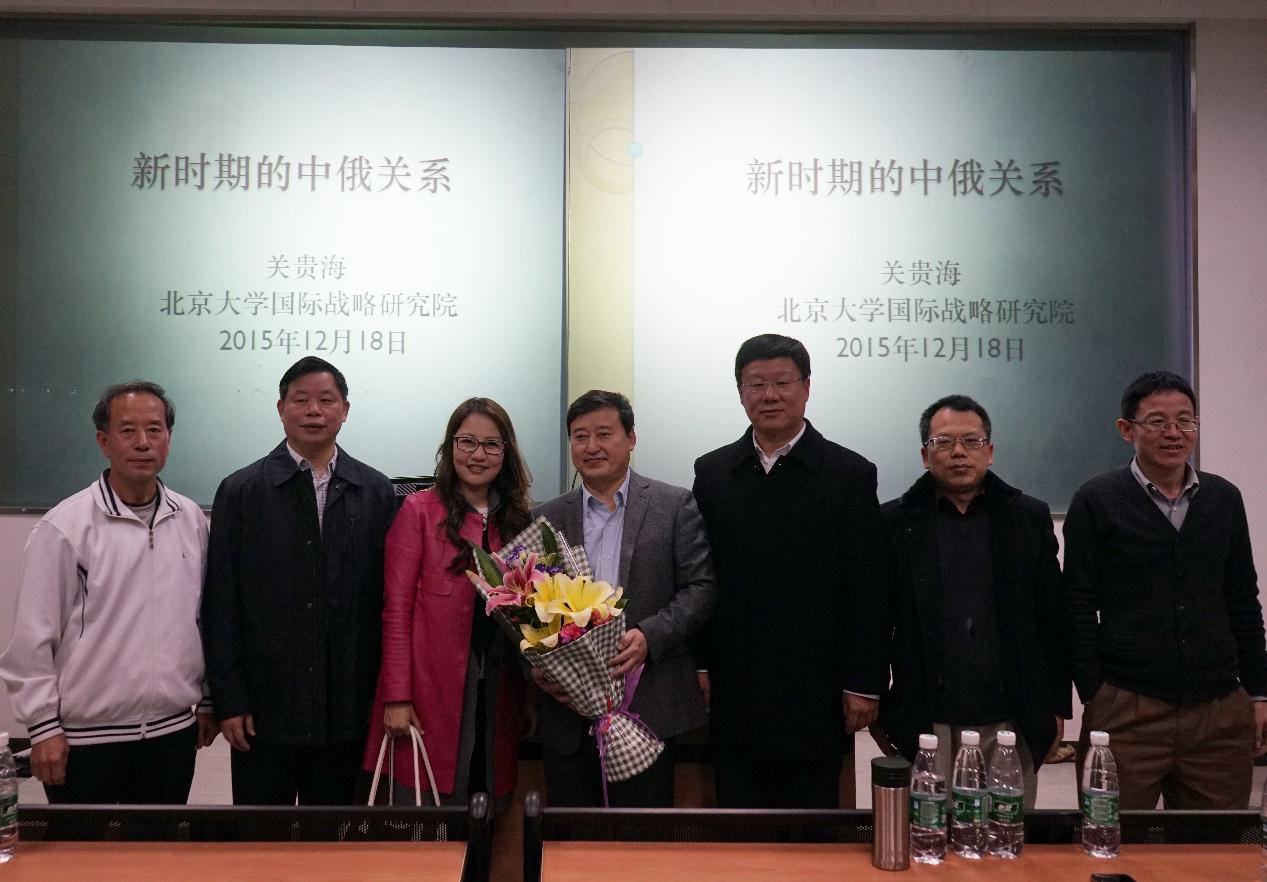 本网讯(文/陈伟健 图/刘欣雅) 2015年12月18日星期五,公司365英国上市公司、国际问题研究所有幸邀请到北京大学国际战略研究院执行副经理,北京大学国际关系公司关贵海教授莅临公司开展“新形势下的中俄关系”专题讲座。本次讲座由公司365英国上市公司副经理、国际问题研究所副所长王树春教授主持,公司党委宣传部部长胡文涛教授、孔庆山教授、黎家勇副教授以及施爱国副教授出席了本次讲座。