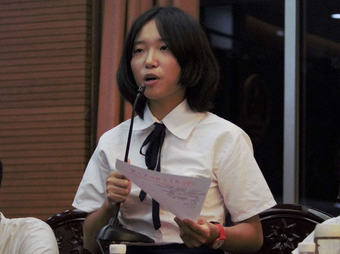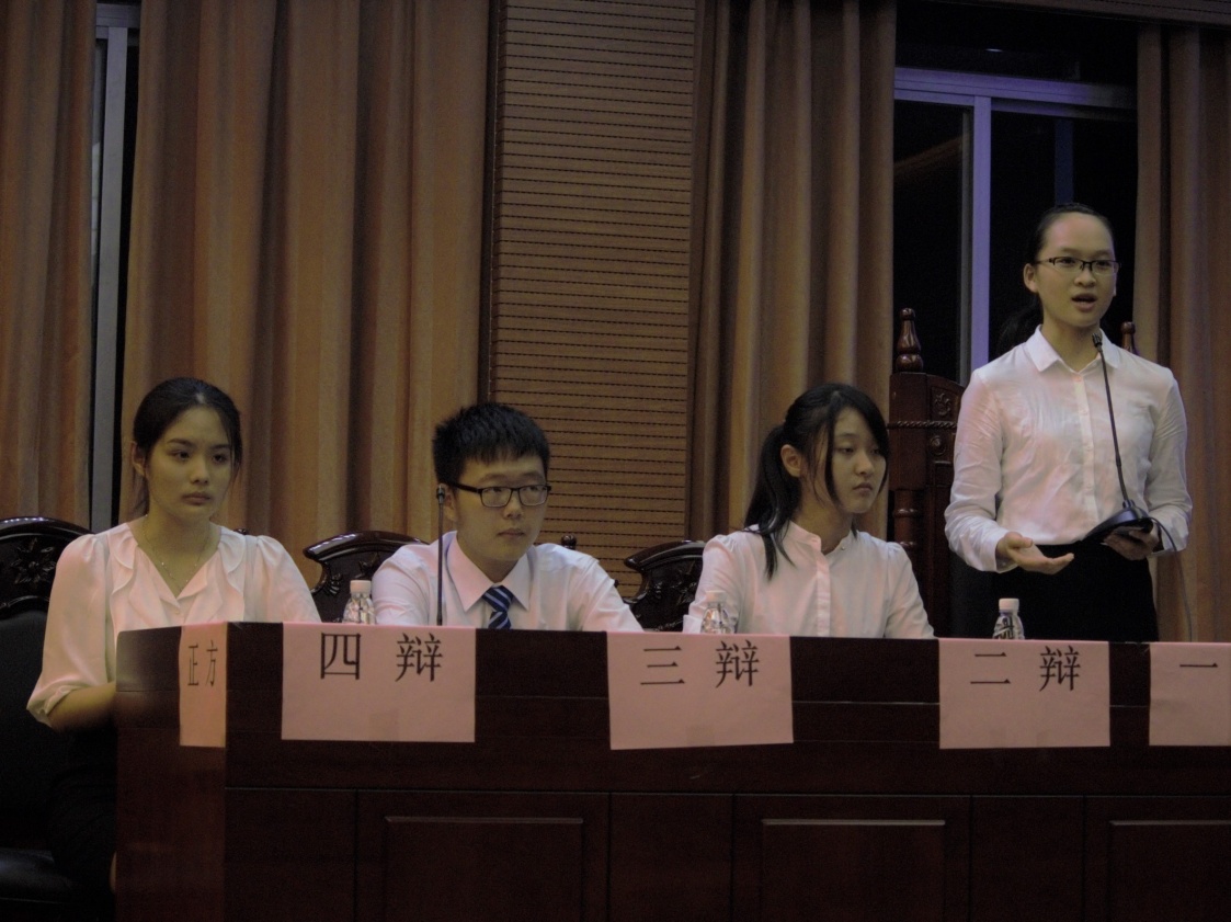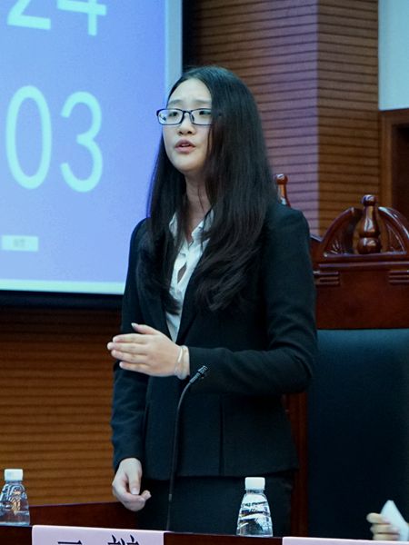 随后,反方一辩赵颖妍同样从三个角度:事实、利益、现实法例出发,说明了“提高公民环保意识主要依靠法律”,面对正方四辩李语彤的质询,虽前期慌张,但很快稳定下来。
