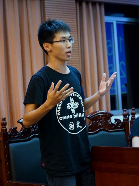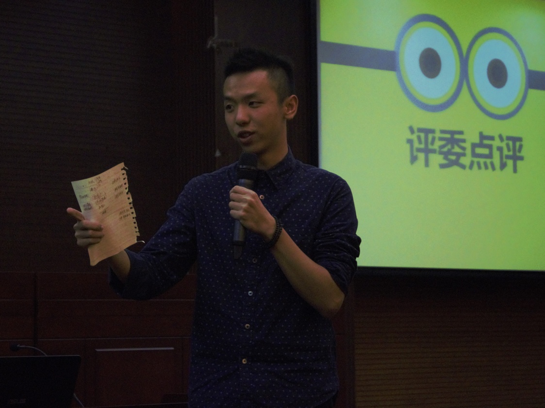 最后主席公布了最佳辩手和获胜队伍的名单,正方一辩张曼玲获得最佳辩手称号,反方法四获得本场比赛胜利。14级优秀辩手罗健点评本场比赛,他开门见山,一针见血地指出双方输赢的原因,正方立论较好,而说理不透;反方立论不足,却说理到位。但在辩论比赛中,说理是决定胜负的关键,所以反方赢得了此次比赛的胜利。