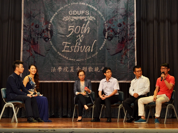 劲歌热舞共欣赏,学习经历共交流,工作经验共分享。为此,主持人邀请了出席晚会的员工上台进行访谈。谈及母校,四位师兄师姐感慨如今的广外环境更包容开放,师弟师妹也更加优秀;同时回忆起昔日在广外那些与友情、成长相关的难忘故事。最后,他们对法学专业员工今后的就业及面试做出指导。翟师姐尤其强调仪容仪表的重要性;而陆昕师兄为了更加客观地说明这个问题,发了三张照片到微信墙上,形象而生动地体现了个人气质与形象的重要性;孙师兄则着重提到情商、智商及搞好人际关系的问题;张师兄则侧重讲到除了专业课之外,还要培养自己在英语等方面的能力这个问题。