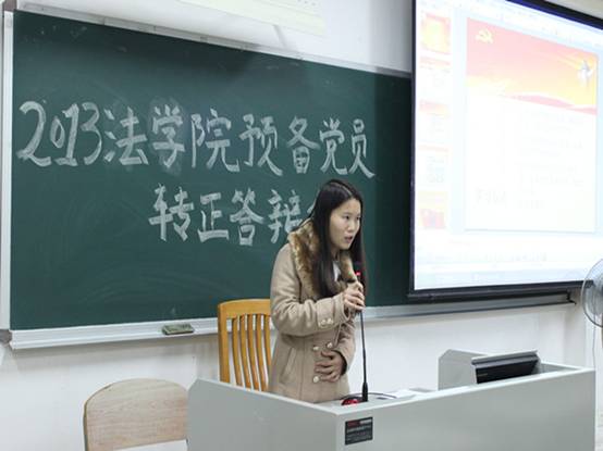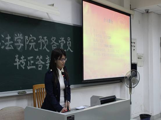 接着是两位预备党员的答辩环节。答辩包括个人展示,支部提问和讨论评议三个环节。她们首先对自己成为预备党员这一年以来的学习,生活和工作做了简洁的汇报,并从中发现了自身的不足,不断提升自己。何欣怡同学先是介绍了自己在成为预备党员之初的思想认识,到现在对党的认识不断深入,深刻体会到要始终把群众的利益放在首位。虽然加入了几个社团,但始终不忘学习,能较好地处理学习和工作的关系,不过处理事情不够干脆,容易急躁,这些都需要在以后的学习生活中努力克服。黄少娟同学就自己思想,学习等方面的转变进行对比,她在成为预备党员的一年里,深入学习了党的理论知识,虽然在平时的社团工作上遇到过困难,但始终不言放弃,对工作认真负责。她自身也仍然存在不足之处:不能较好地协调学习和工作的关系,有时难以取舍,希望党组织能帮助改正。