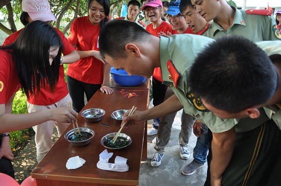 下午3:00队员们转战武警中队,与武警们一起玩游戏。队员们准备了一系列节目——游园会和运动会。在踩气球活动中,队员们与武警的对阵充分体现了军人不一般的体质与气魄。在花样接力中,武警们蛙跳和鸭子步的速度直让队员们鼓掌喝彩。但是,在夹波珠的活动中,女队员的巧手使她们连连获胜。最后环节中,队员们的太极拳与武警的格斗形成了柔刚结合的局面,让人回味无穷。