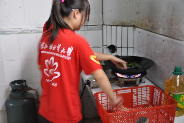 而最辛苦的莫过于照顾整个队伍一日三餐,为了让全部队员吃得饱,有力气开展各项工作,队员既要精打细算又要大展厨艺。他们每天都要在预算范围内为大家安排尽量美味的饮食。他们每天早晨5点多起床买菜煮早餐,每顿饭前两三个小时就开始准备煮饭,每顿饭后及时洗碗筷等餐具。呆在厨房的日子让有的队员感叹:“我终于深深地体会到天下母亲的伟大,我决心以后为我妈分担一些家务活!”