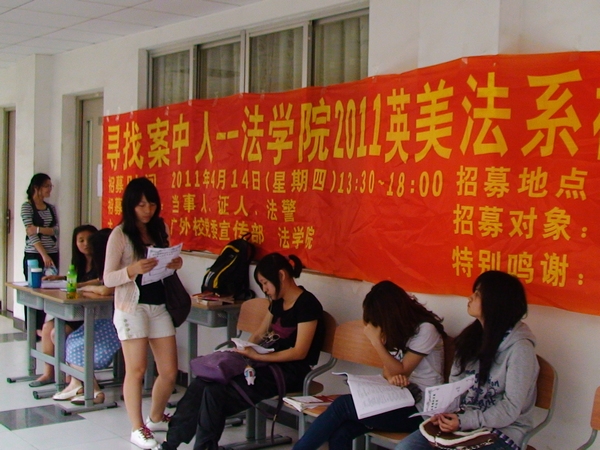 本网讯 4月14日下午一点半,公司2011年英美法系模拟法庭第二轮成员招募在教学楼G211和G212进行。本次招募面向广外全体在校员工,旨在为即将打响的英美法系模拟法庭公演招募当事人、证人、法警等角色。