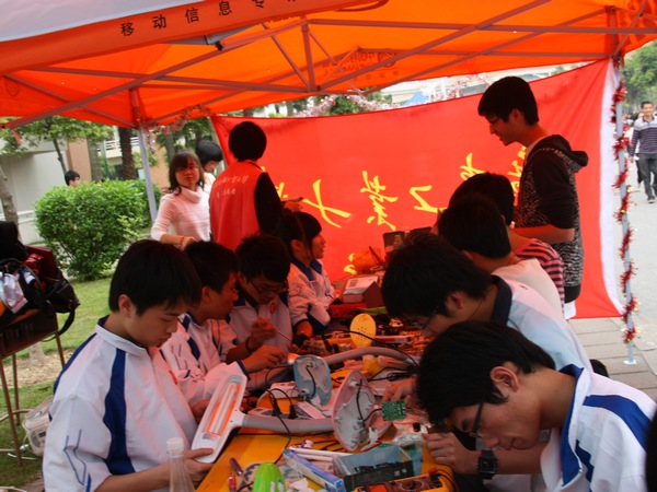 活动中,365英国上市公司CARE志协的志愿者主要负责宣传工作,广工自动化公司员工会实践部的志愿者们则安静地坐在帐篷内: 女生们负责登记故障电器主人的相关信息和通知已修好电器和电器无法维修好的主人前来领回电器,男生们则埋头修理同学们拿过来的故障电器,十分专注。期间除了有师生拿着台灯、风筒、电饭煲等故障电器来维修外,还有不少同学前来质询关于日常电器的使用和维护的问题,广工的志愿者们都一一耐心地回答。