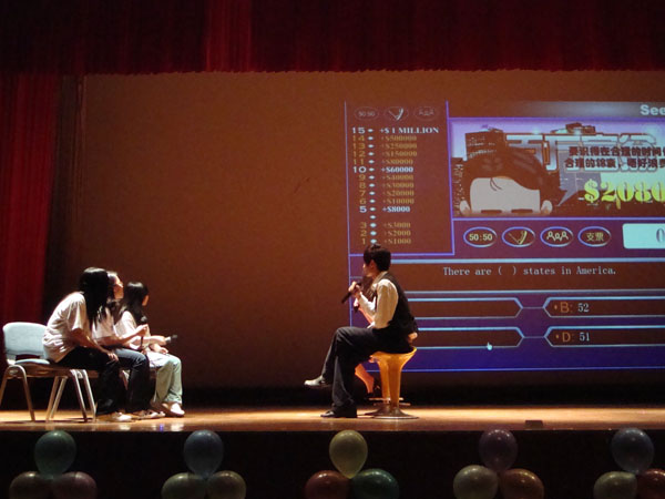 “百万富翁”的时候,气氛十分紧张,场上选手的每一个选择都令场下的观众为这捏把汗。第四个队伍才回答到第二题,就不幸答错,被淘汰。观众席上不时传来几声委婉的叹息。而SunFlower队激流勇退,以稳为主,在最后一条问题上明智地选择了“放弃”,为夺冠打下了坚实的基础。