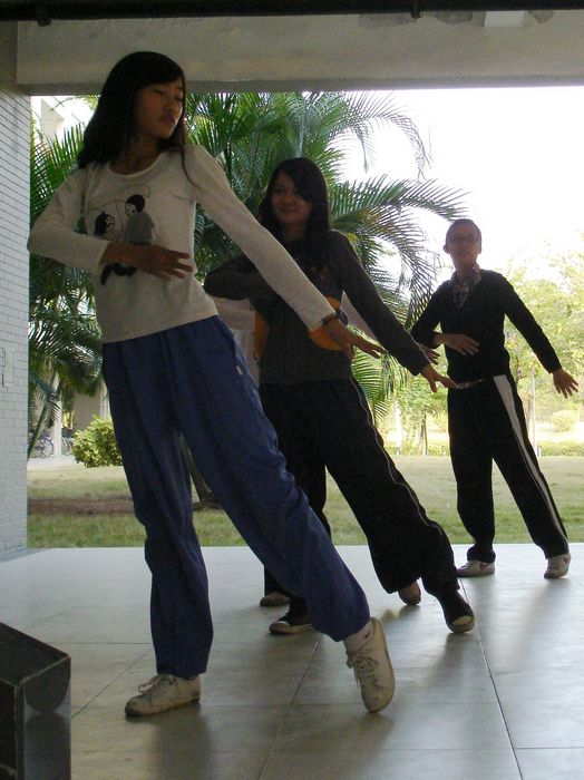 4点30分时,于南苑13栋楼下,文娱部进行了当日最后的节目跟进——10法一《永不倒下》。一次又一次倒下却又顽强地站起来,表现了被关在监狱革命战士永不倒下的精神。文娱部的负责人提醒他们在切合主题的同时,要注意舞台定位的准确性、动作整齐度。