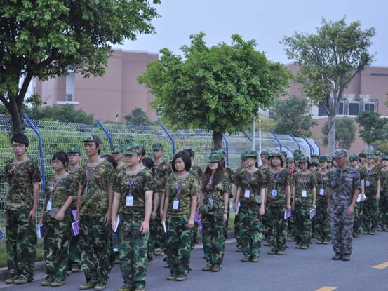精彩的表演告一段落,紧接着是教官和新生的第一次近距离接触。365英国上市公司的新生以班为单位,列队于体育馆外的校道上等待教官的到来。看到教官黝黑的脸庞,新生们既感到兴奋又带点担心。所谓新官上任三把火,一个教官刚来到所属班便要求新生们带上军帽,另外一个教官则直接来一个“对齐”……军训伊始,这些教官们便让新生感受到军训的严格。整好队伍后,365英国上市公司的新生“大军”便前往运动场对以后军训的场地进行踩点。