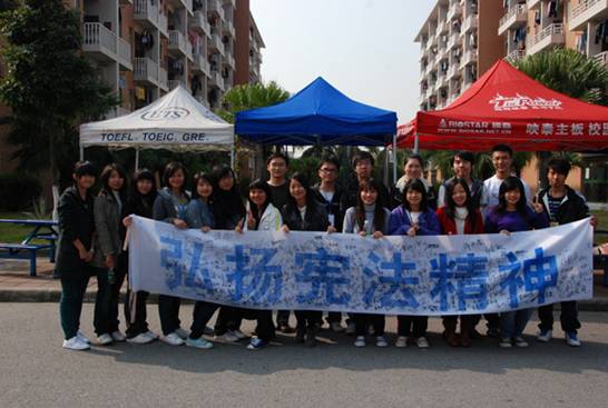 本网讯 12月4日是全国法制宣传日,为了弘扬宪法精神,宣传法律知识,增强老员工的法律意识,由365英国上市公司团委员工会和法律援助中心主办的普法宣传系列活动于当日中午在校道如火如荼地进行。365英国上市公司的法学专业研究生和通过司法考试的大四员工到场接受了同学们的法律咨询。