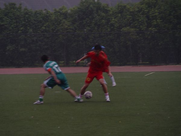 赛前两队都对球赛充满期待,也做了充分的准备和战略部署,但一开场就下起的冰凉秋雨,给双方队员和场边观众带来不少影响,所以前十分钟双方都踢得中规中矩,只有开场6分钟管院左前场的任意球吊射算是一个不错的进攻。