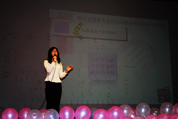 而“求奇”队则采取模拟法庭的形式,对大学城志愿活动服务的现存问题进行了讨论。他们建议,要进一步完善立法,并且要支持小型志愿者队伍的活动。最后出场的“逍遥法外队”则把注意力放在了志愿者组织对于志愿者权利保障所起的作用的问题上。他们在展示中说道,由于志愿者的沟通和反馈机制不够有力,被服务对象对志愿者存在着认识上的误区,他们很多时候把志愿者等同于廉价劳动力。他们提出,要进一步明确志愿者与志愿者组织而这的关系,完善志愿者组织,呼唤社会保障力量,救助被侵害的志愿者。