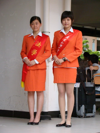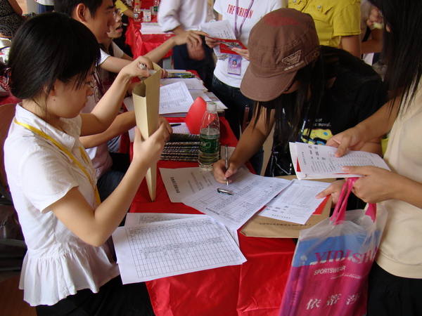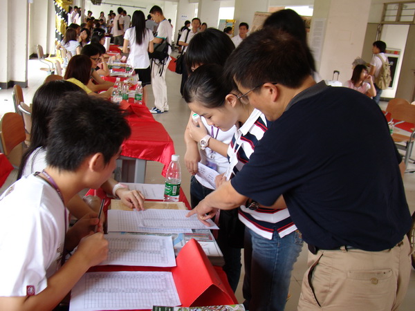 接待处分设为一个接待总站和校道边的四个分站,1栋总站设有签到处、资料领取处、银行卡领取处、办理户口处、咨询处、绿色通道手续办理处等,各个环节都有志愿者陪同。待新生办理完总站业务之后,机动组会立即安排志愿者帮助新生搬运行李至宿舍。分站的志愿者则忍受着烈日和热浪,坚守着自己岗位,为沿途而来的新生、家长指引答疑,把他们带到总站。整个接待现场,秩序井然。