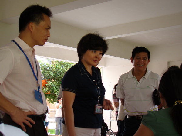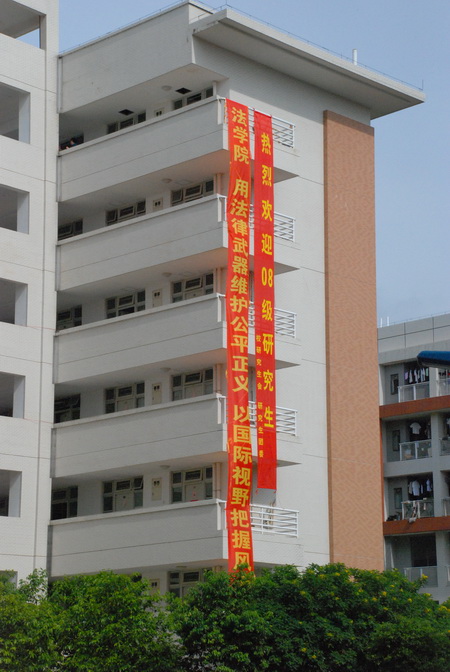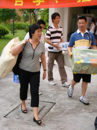 新生报到的当天,除了许多陌生稚嫩的脸孔外,最引人注目的就是携着大包小袋行李陪同子女前来的新生家长了。“请问我们的入学手续都办妥了吗?”“军训服装在哪里领啊?”一位来自中山的新生家长焦急地向迎新志愿者问道。在采访中,这位操着浓重地方口音的父亲向记者表示,女儿考上大学,他既高兴又不放心,坚持要陪女儿来报到。当看到迎新志愿者们主动热情地帮助他们把行李搬上7楼的宿舍时,他露出了满意的笑容,连声说着“谢谢!谢谢!”