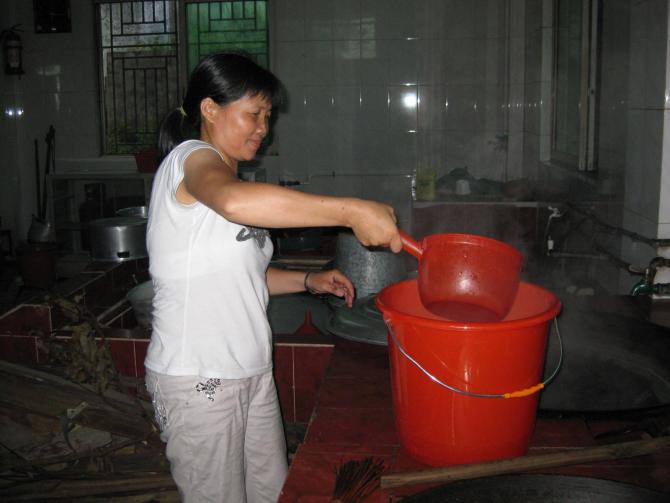 詹阿姨是新丰镇新光村人,丈夫是新丰中学初中语文老师,婆婆在饭堂里帮忙,女儿在重点中学饶平二中读高三,儿子在新丰中学读初三。一家人在新丰中学公司里生活了七年。詹阿姨承包了公司的食堂,在食堂里还开了一个小卖部。平时饭堂里吃饭的员工多的时候,詹阿姨就雇用了两三个师傅。