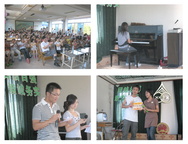 最后的重头戏就是汇演的节目啦,由于实际情况和假想的不可能完全一致,我们的节目单经历了一次删除(健美操对于广播体操都很少做的孩子们还是太难了,不得不忍痛删除),一次添加(“汶川在呼唤”,终于找到表达我们对地震死难者缅怀的方式),N次改动(三只小熊比灰姑娘更符合员工们的英语能力;比起动感超人,男生更钟意“难兄难弟”的舞步;“爱 因为在心中”很有感觉,也不会像“感恩的心”那么老套……)。当然,最后出炉的节目单要用更新,更好,更强大来形容啦。