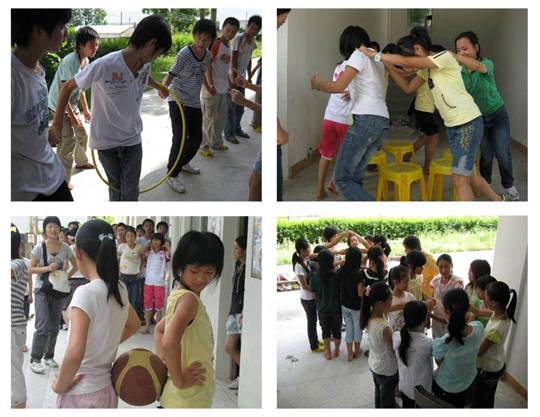 该活动不同于一般的趣味运动会,其宗旨是“微笑、牵手”,目的是让同学们在游戏中学会用心交流,敢于交往,善于合作,形成良好的心理素质,增进同学间的友谊。此次项目的游戏包括了“一圈到底”、“抢板凳”、“螃蟹跑”、“抢板凳”、“解手环”、“草地排球”等游戏。