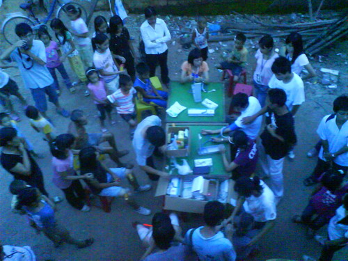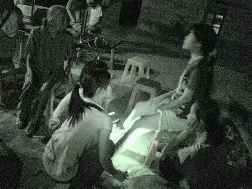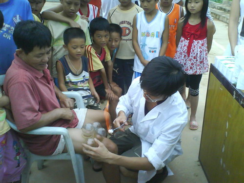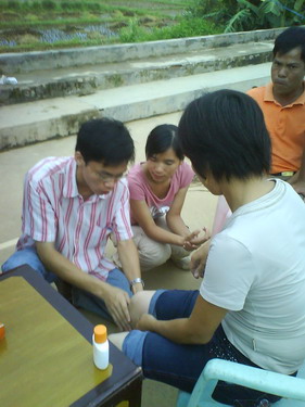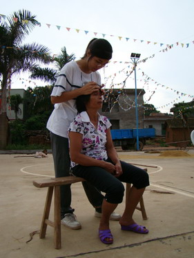 看,广中医的师兄师姐们真有功底,平时有空他们都会给我们复习推拿的一些基本手法。义诊的时候,他们几个像八仙过海一样,“各显神通”。大盛兄穿着医袍穿梭在人群中拔火罐,样子好专业;芝云兄的推拿按摩手法“出神入化”,好象他打太极一样刚柔并济。李哲姐就是头部按摩的高手啦,我们刚学头部按摩可就成了“洗头妹”了,呵呵。莹仪姐好细心,给阿婆量血压时开了个很详细的“药方”。美珍姐也不赖,膝头肩部按摩技术娴熟,受伤部位的消毒工作好完美。队长婉华同志也穿上医袍,成了师兄师姐们的得力助手。剩下的我们几个“跑龙套”的在旁边接待,推拿,按摩,熏艾条。