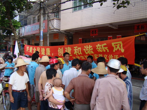 长长的横幅上写着:“关注全民健康,创建和谐新风。”