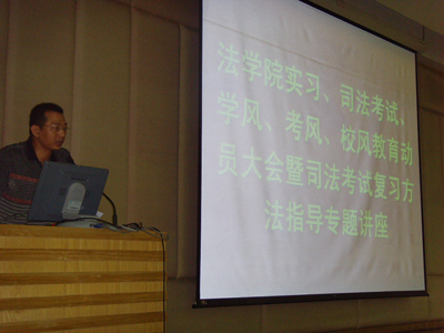 随后范利平老师上台做了司法考试的动员讲话。她认为这次大三同学可以报考司法考试是一大喜讯,应该抓住机遇,要有必胜的信心。同时,公司为了尽最大的努力帮助同学们通过司法考试,公司准备开办暑期的“广外司法考试培训班”,以提供全面的,针对性的复习,范老师认为如果条件许可,大家可以认真考虑。