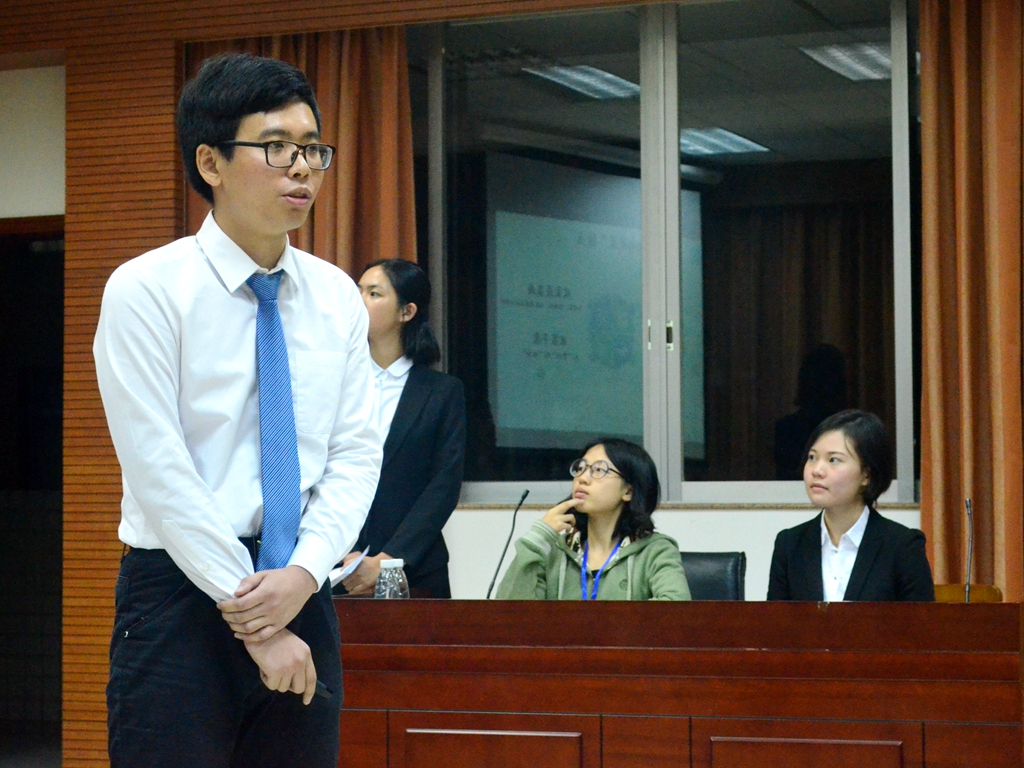 来自14国政的刘若锋对其论文《论印度对美国亚太再平衡战略的反应》从背景、驱动因素、具体行动、结论及前瞻四个方面做了简短的陈述。第二组出场的南海舰队由16政二的黄悦和潘康钰组成。面对评委的问题,她们也能用专业的术语应答,可谓初生牛犊不怕虎,格物致知不止步。最后出场的是15国际关系研究生袁晓威,相比前两组选手,他拥有更深厚的知识储备和丰富的学术活动经验,因此他敢于向大陆学界缺乏系统研究的台湾当局“新南向政策”发起挑战,逻辑科学,条理清晰,得到评委的肯定。