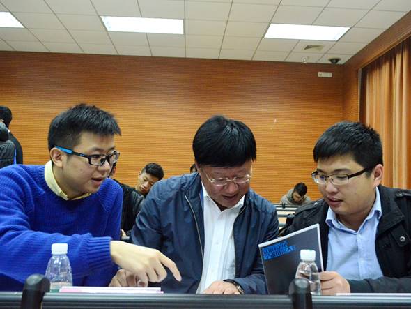 在点评环节中,王树春教授肯定了两位16级新生勇于挑战的精神,还特别强调“问题意识”以及对论文写作的训练;另外两位评委陈宇老师和杨嵩棱老师也就摘要内容的完整性、引言的格式等细节要求进行指导。赛后,评委与选手进行友好互动,深化学术关系,场面融洽温馨。